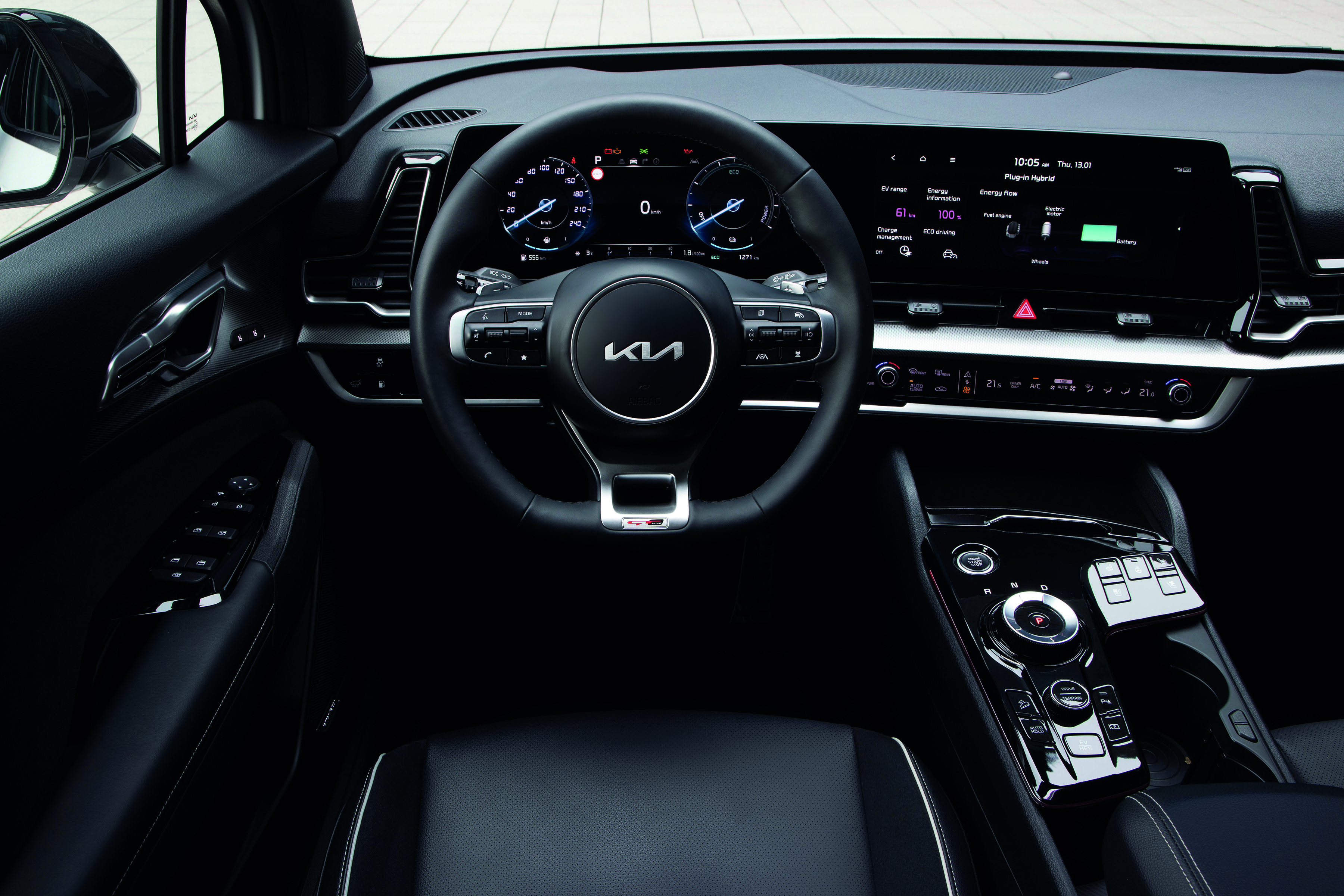 Net als andere Sportage-uitvoeringen, biedt ook de Plug-in Hybrid een ultramodern interieur met hoogwaardige materialen en luxe features. Het hoogtepunt in het binnenste van de Sportage is het ultramoderne en prachtig vormgegeven dashboard dat is voorzien van een groot, gebogen display dat bestaat uit twee schermen van 12,3 inch. Het geavanceerde infotainmentsysteem is over-the-air te updaten en gebruikers kunnen op afstand verbinding maken met hun Sportage via Kia Connect, een smartphone-app. De interactieve, gebruiksvriendelijke technologie geeft ook toegang tot belangrijke functies zoals de Kia Live Services, online navigatie, online spraakherkenning en agenda-integratie via smartphones.